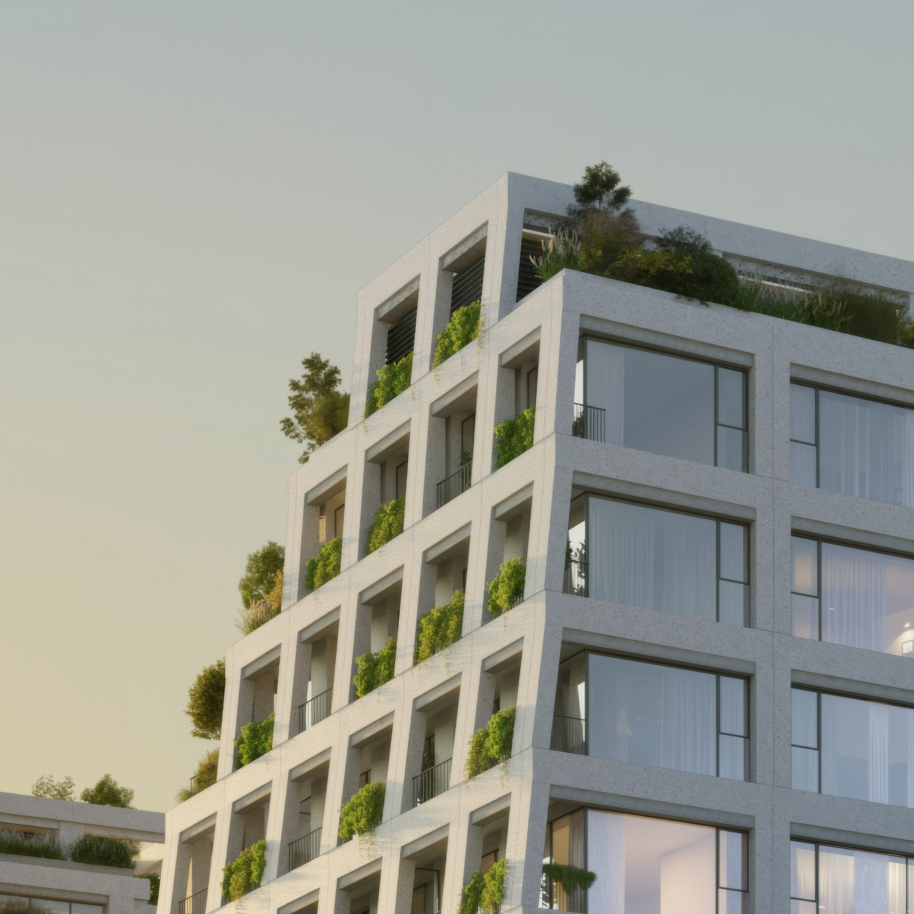 Zwieńczeniem budynku jest zieleń, obecna na wielu poziomach, od parteru po dachy. Kaskadowa forma tworzy "zielone pagórki" widoczne z ulicy. Na siódmym piętrze zaprojektowano tarasy sąsiedzkie. Donice i ogrody pomyślano jako otwarty proces, mieszkańcy mogą je dalej rozwijać i personalizować.