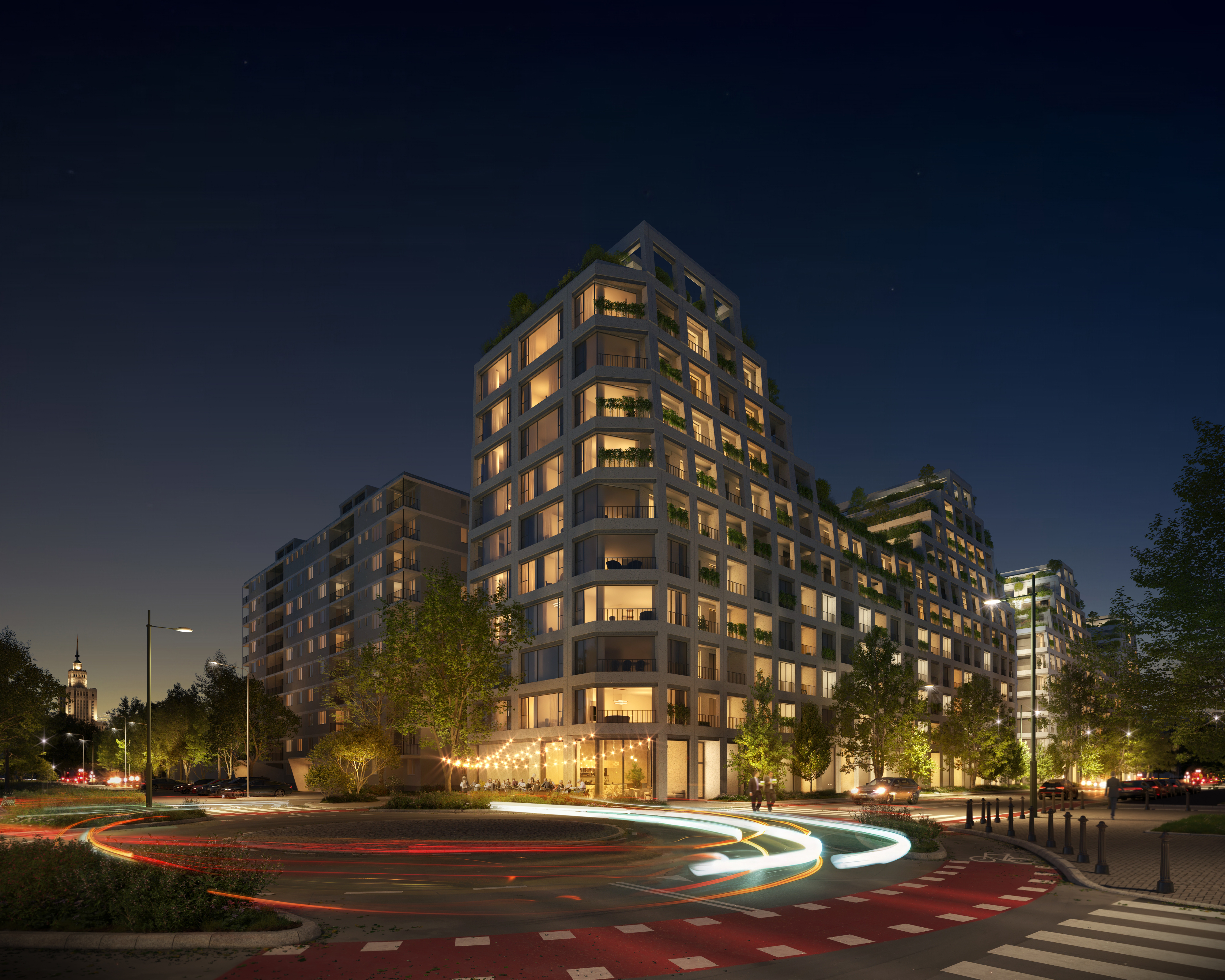 - Zieleń jest elementem tożsamości: kaskadowe dachy, tarasy sąsiedzkie na 7. piętrze, ogrody inspirowane BUW.